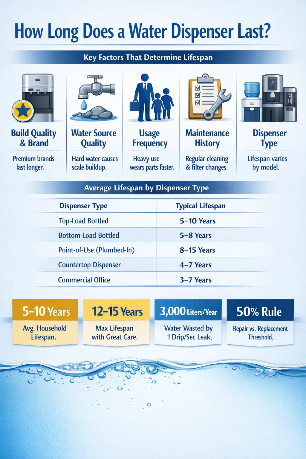 Kaikki vesiautomaatit eivät vanhene samalla nopeudella. Useat muuttujat vaikuttavat siihen, kuinka monta vuotta voit realistisesti odottaa laitteeltasi ennen kuin suorituskyky heikkenee tai osat alkavat pettää.