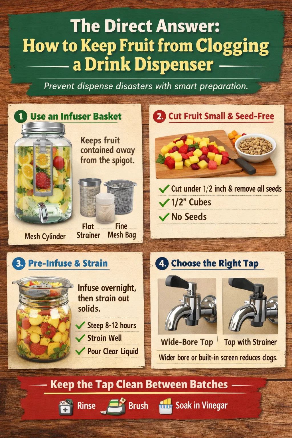 Luotettavin yksittäinen ratkaisu on pitää hedelmät fyysisesti erillään hana-alueesta infusorikorin avulla. Monissa nykyaikaisissa juoma-automaateissa on irrotettava infusorisylinteri – verkko tai rei'itetty putki, joka pitää hedelmät purkin keskellä tai yläosassa. Neste kulkee verkon läpi ja imee makua, mutta kiinteät palaset eivät koskaan pääse hanaan.