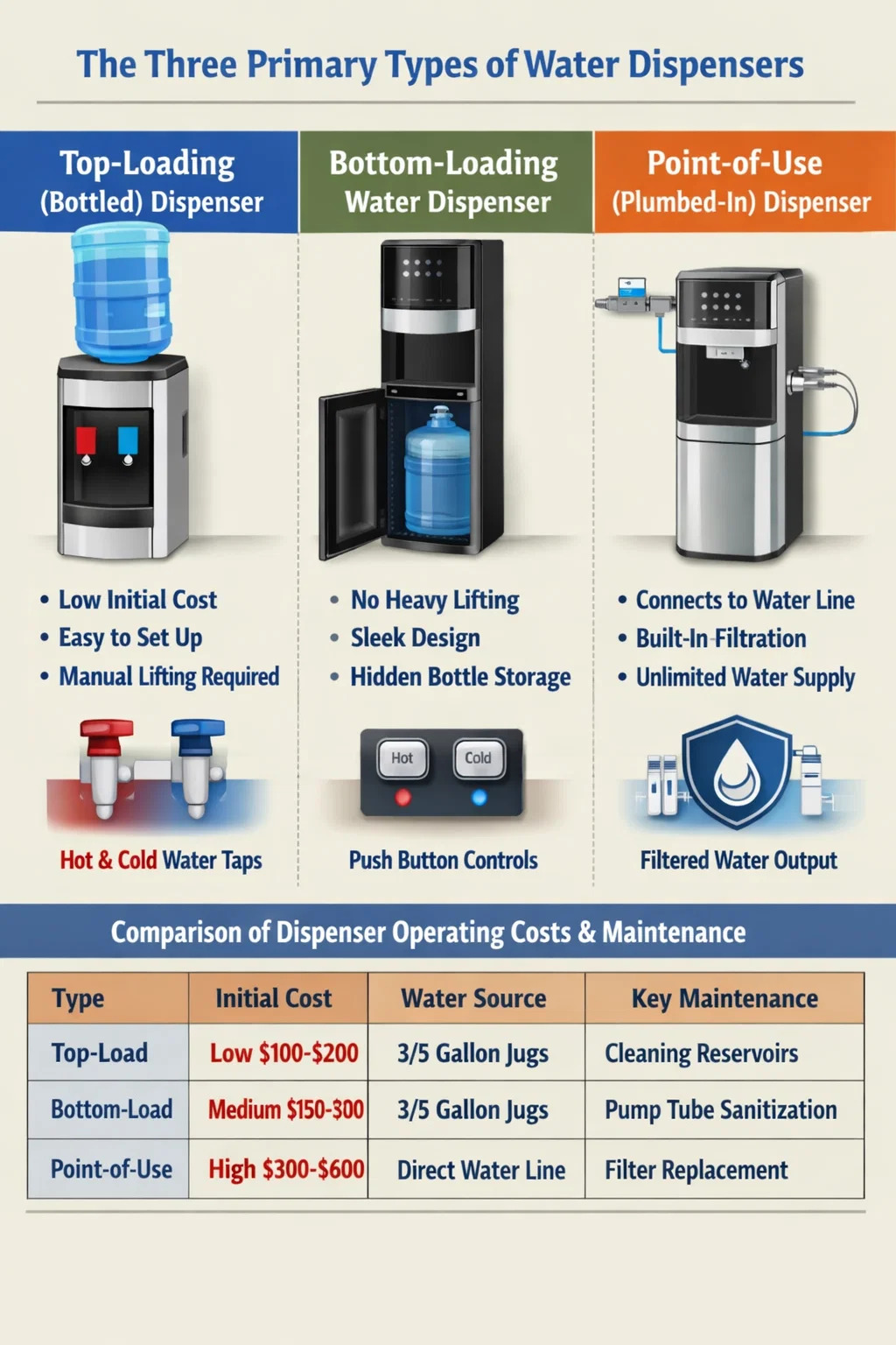 Kodin tai toimiston nesteytysratkaisuja arvioitaessa vesiautomaatit luokitellaan yleensä kolmeen eri tyyppiin niiden latausmekanismin ja vesilähteen perusteella: Ylhäältä täytettävät (pullotetut) annostelijat, alhaalta täytettävät annostelijat ja käyttöpisteen annostelijat (putkiset). Jokainen järjestelmä käyttää erityistä vesiannostelijan hana konfiguraatio virtauksen hallitsemiseksi, ja oikean valinta riippuu fyysisestä tilastasi, budjetistasi ja halutusta ylläpitotasosta.