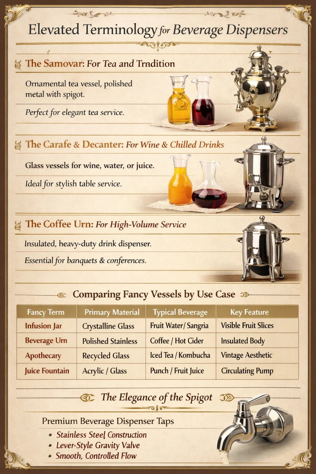 Jos etsit hienoa sanaa juoma-annostelijalle, tarkimmat termit riippuvat astian suunnittelusta ja kontekstista. Tyylikkäisiin sosiaalisiin tapaamisiin, ehdot "Karahhvi", "Karahvi", "Samovar" tai "Urna" käytetään usein. Ammattimaisessa catering-palvelussa ja huippuluokan vieraanvaraisuudessa näitä tuotteita kutsutaan usein nimellä "Mehukarahvit" tai "Infuusiopurkit." Vaikka vakioyksikkö on toimiva, ylellinen versio on ktaikealaatuinen juoma-annostelijan tappi muuntaa yksinkertaisen kontin huoltolaitteiston keskeiseksi osaksi.